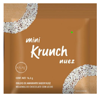 Ingredientes: Harina de amaranto, 45% relleno de chocolate con leche (maltitol (16,5g/100g), manteca de cacao, 11% leche parcialmente descremada, pasta de cacao, sólidos de la leche, lecitina de soya, sal, saborizante idéntico al natural, stevia (4,4mg/100g)), harina de avena, 5% de amaranto inflado, inulina de achicoria, saborizante natural, stevia (7mg/100g), caramelo clase IV.